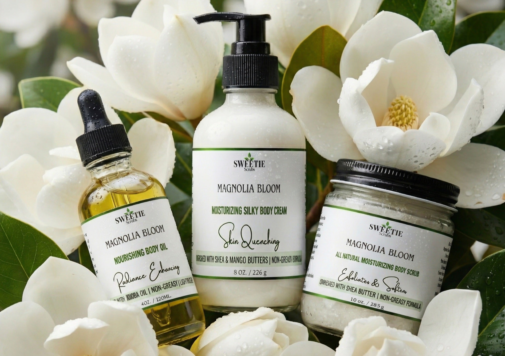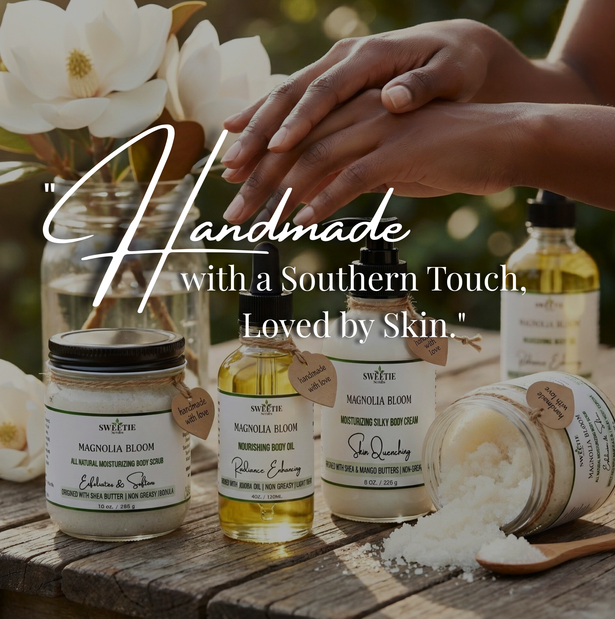 Wrapped in the soft, romantic scent of blooming magnolias, each product leaves you glowing, touchably smooth, and kissed with that sweet Southern charm.