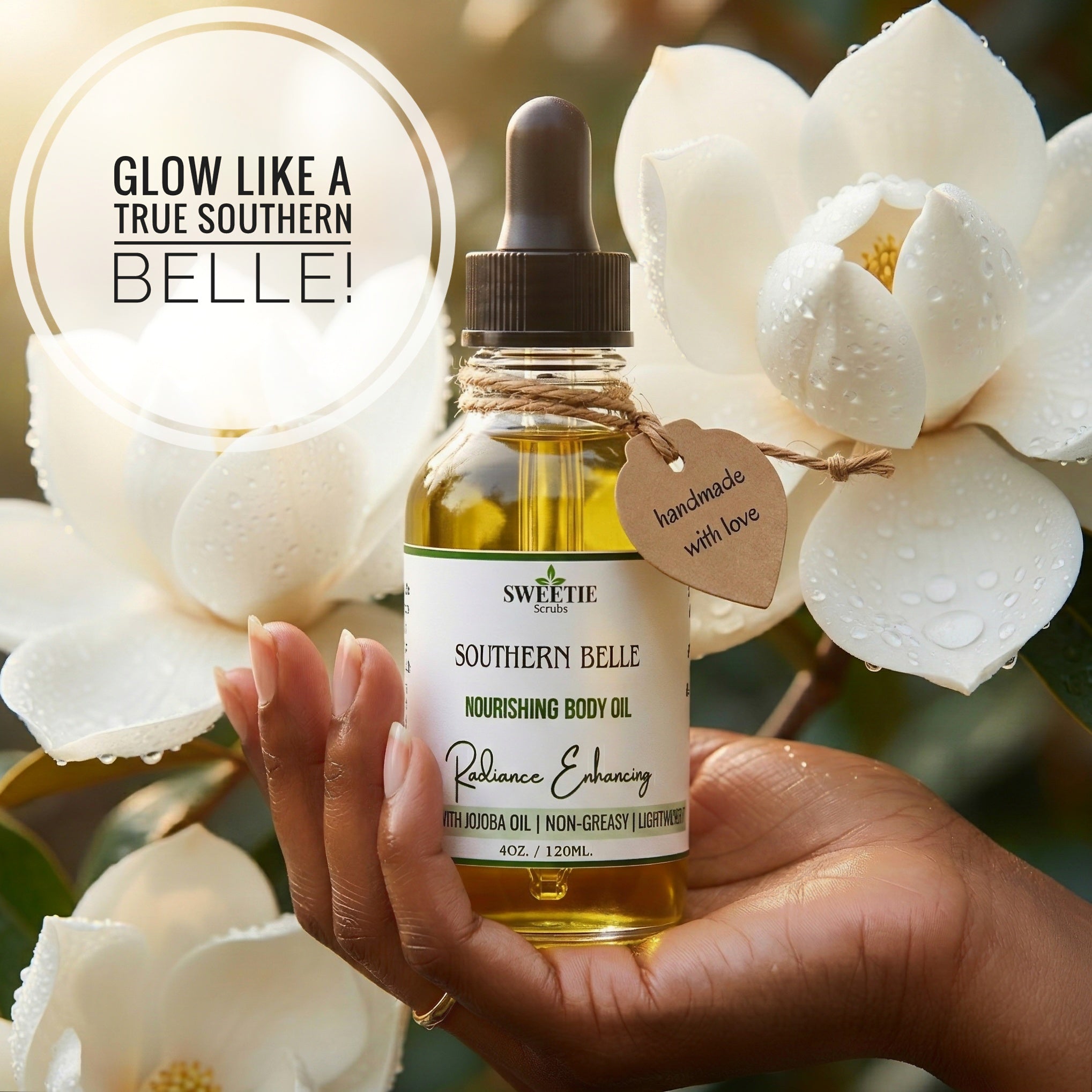 Southern Belle is a lightweight, non-greasy body oil that melts into your skin like warm Mississippi sunshine, leaving you silky soft, smooth, and beautifully radiant — never slick, never heavy.