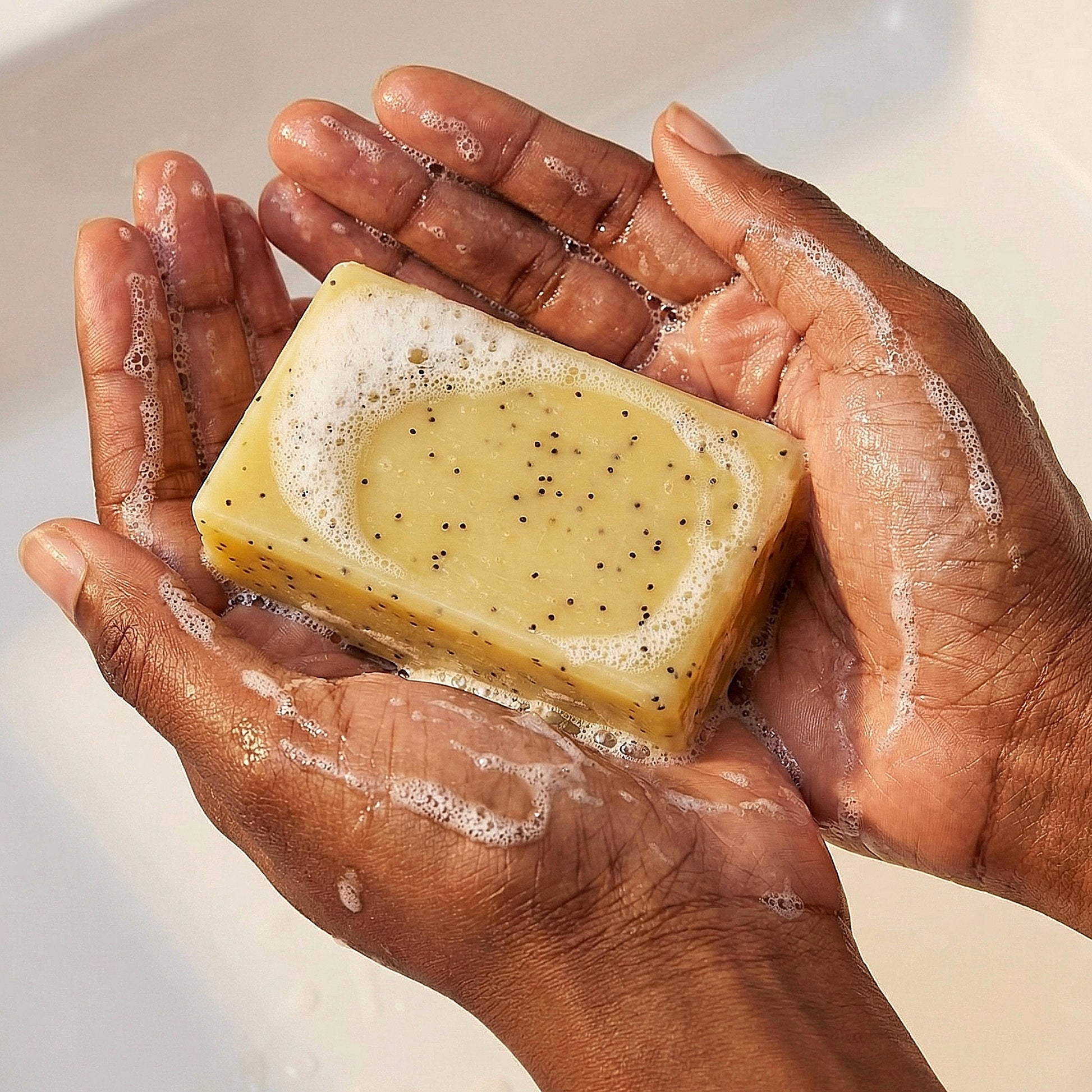 Lather the bar between wet hands, a cloth, or sponge. Gently massage onto skin in circular motions, allowing the poppyseeds and sugar to add texture to your cleanse. Rinse thoroughly.
