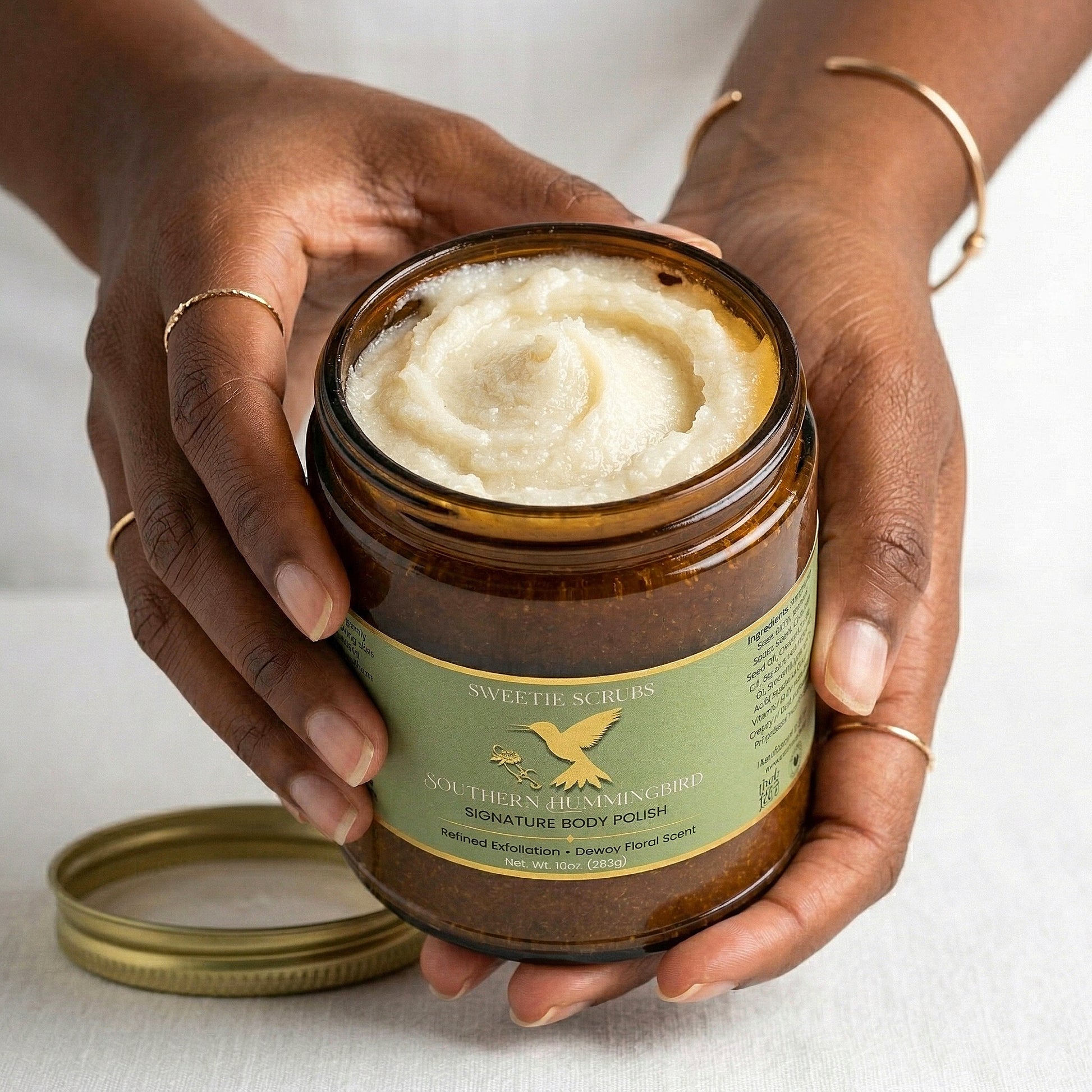 Indulge your skin in the delicate luxury of our Southern Hummingbird Signature Body Polish, a beautifully exfoliating treatment designed to smooth, soften, and deeply nourish. Crafted with rich shea butter, silky jojoba oil, lightweight squalane, meadowfoam seed oil, and other nourishing botanical oils, this polish gently buffs away dull, dry skin while restoring lasting hydration and glow.